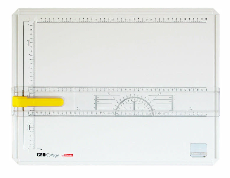 Tekenbord GeoCollege A3. Materiaal: kunststof. Kleur: wit. Te gebruiken voor A3 papierformaat. Uitvoering: schaalaanduiding voor formaat en papiermarkering, met gradenboog, magnetische papierklem met geïntegreerde drukknop en venster voor de juiste uitlijning van het papier. Met extra klem om het papier vast te zetten. Ergonomische greep met drukknop met stop-en-go mechanisme.