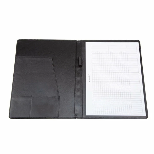 Schrijfmap Alassio Balocco A4. Gemaakt van hoogwaardig polyester. Binnenin is er ruimte voor het opbergen van uw visitekaartjes en heeft de map een handig A4 opbergvak. De schrijfmap is uitgerust met een notitieblok en pennenhouder. Afmeting 31,5 x 25 x 2 cm. kleur noir.