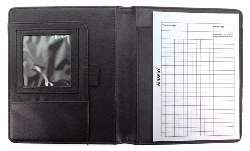 Kunstlederen schrijfmap Alassio Bormio A5 zwart, voorzien van insteekmap, pennenhouder, visitekaarthouder, opbergvak. Afmeting 23x18x2,7cm