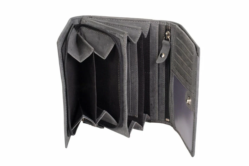 Portefeuille voor dames RFID Met TFID folie, hoog model, negen kredietkaart vakken, drie opbergvakken, compartiment met doorzichtige folie, opberg vak met rits, twee grote opbergvakken, één opberg vak voor biljetten, opberg vak voor munten met rits. grijs leer ca. 13 x 10,5 x 2,5 cm