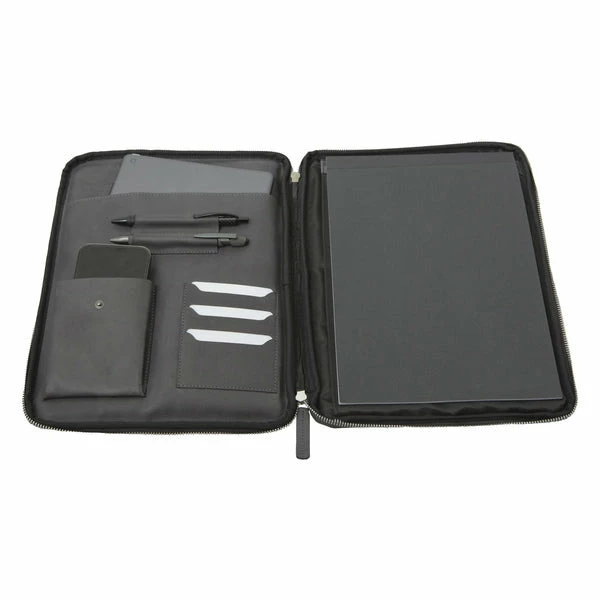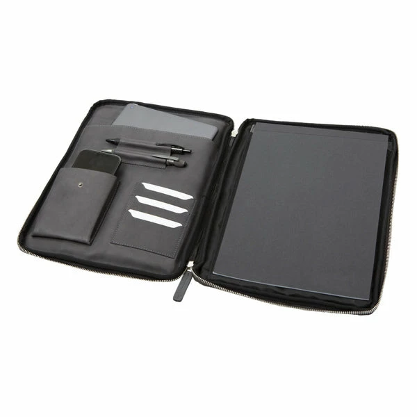 Schrijftablethoes Pride and Soul TERRA grijs leer met rits rondom, twee vakken met ritssluiting aan de voorzijde, gewatteerd tabletvak, universeel vak, twee pennenlussen, drie vakken voor creditcards/visitekaartjes, vak voor schrijfblok, vak voor collegeblok, A4-blok. 25 x 34 x 2cm.