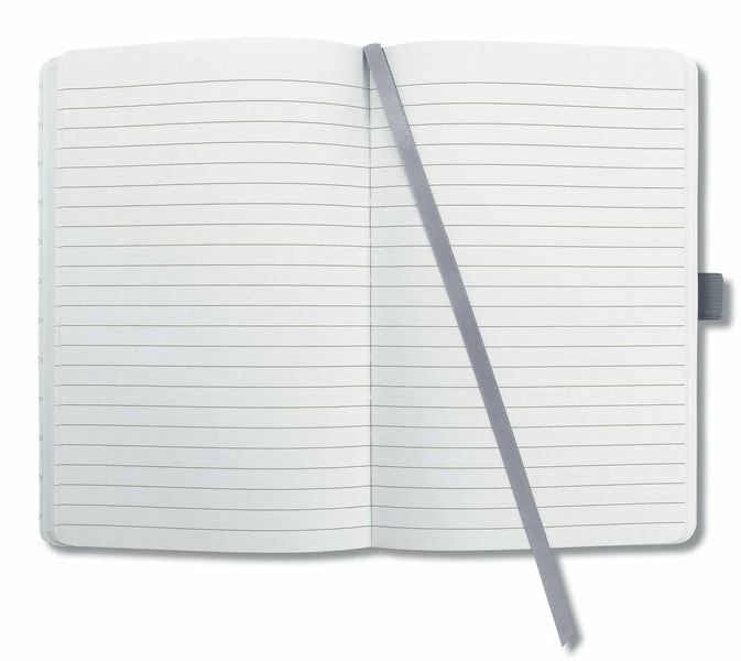 Notitieboek met wit gelinieerd papier, 80grs (zuurvrij, houtvrij en elementair chloorvrij). FSC gecertificeerd. 174 pagina’s waarvan 16 geperforeerd. Het notitieboekje is voorzien van penlus, elastieksluiting, leeslint en opbergvak. De cover is gemaakt van zacht kunststof met een 3D effect. Formaat A6: 95x150x16mm. Kleur gletsjer grijs