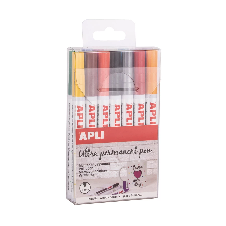 Verfstiften met fijne punt (1-2 mm), 14 verschillende kleuren: zwart, blauw, groen, rood, roze, geel, donkergeel, oker, bruin, grijs, paars, lila, lichtblauw en wit. Stiften op oliebasis, lang houdbaar, perfect voor vloeiende strepen en waterbestendig (bestand tot 60°C). Kan gebruikt worden op vele oppervlakken zoals keramiek, serviesgoed, steen, glas of hout. Niet geschikt voor de vaatwasmachine.