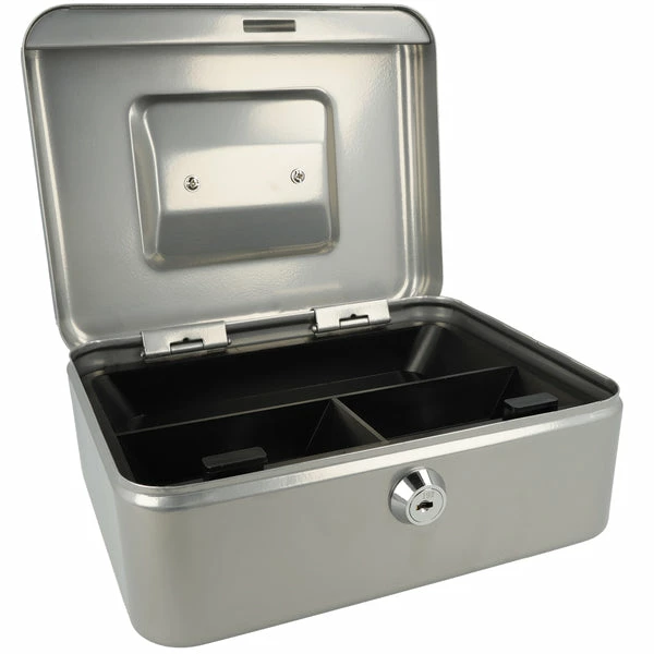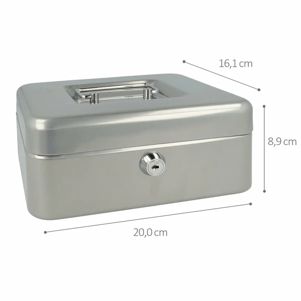 Met deze geldkist bergt u uw geld of waardevolle spullen veilig op. Deze geldkist gemaakt van staal wordt geleverd met 2 sleutels en heeft een kunststof inzet met 3 vakken voor munten. Doordat de geldkist een hangreep heeft die in de deksel valt kunt u de kist makkelijk opbergen. Afmeting: 200x161x89mm. Kleur: zilver.